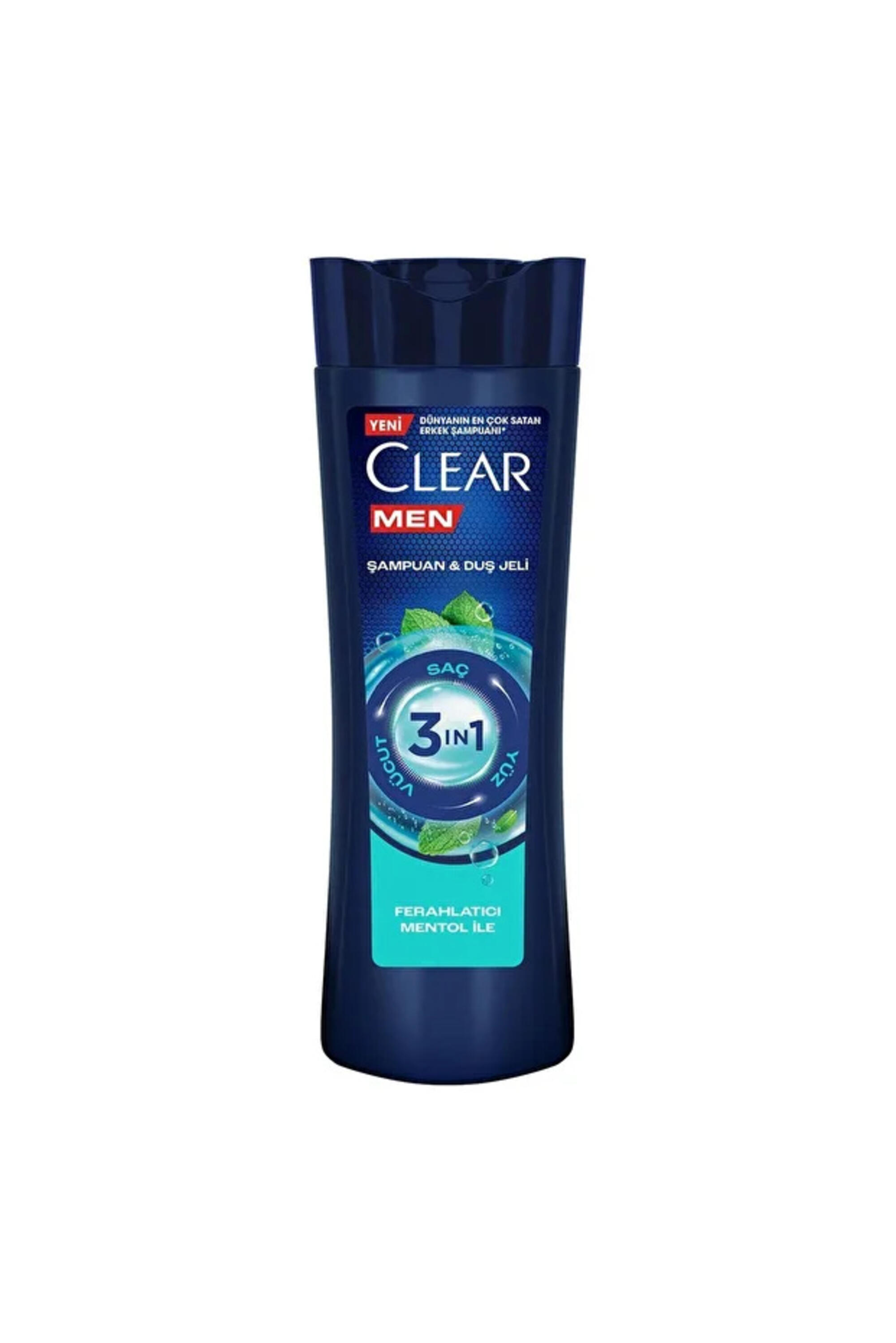 Clear’dan yepyeni bir inovasyon! Clear Men 3 in 1 Şampuan & Duş Jeli Ferahlatıcı Mentol 350 ml ile üçlü etki, güçlü bakım tek şişede. Şampuan ve duş jelini tek bir üründe bir araya getiren Clear Men 3 in 1 Şampuan & Duş Jeli Ferahlatıcı Mentol, tüm vücut için kepek endişesi olmadan temizlik ve bakım sağlamaya geliyor.* Clear’ın 3’ü 1 arada inovasyonuyla geliştirilen erkek şampuanı ve duş jeli, %100 erkeklere özel geliştirilmiştir.